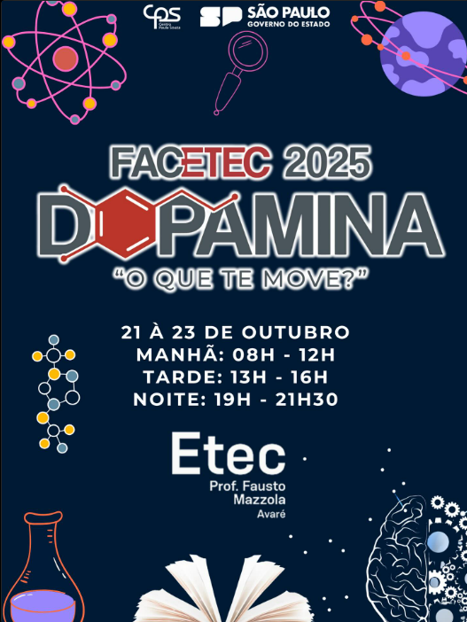 De 21 a 23 de outubro, nossa Etec será palco de muita criatividade, inovação e conhecimento com o tema “Dopamina: o que te move?” ⚡